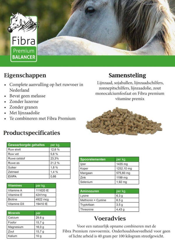 De Fibra Premium Balancer is een complete Balancer die alle vitamines, mineralen en spoorelementen aanvult die je paard/pony naast voldoende ruwvoer nodig heeft. Door de hogere dosering vitamines en mineralen kun je met een kleine dosering alles dagelijkse nutriënten aanvullen. Door de samenstelling is het daarbij ook voor veel verschillende paarden en pony's geschikt en heeft het een zeer lage suiker en zetmeel waarde.