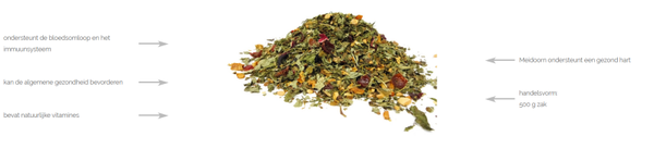 De combinatie van dit geselecteerde kruidenmengsel bevat natuurlijke vitamines, waaronder vitamine C, die dienen om het afweersysteem en het immuunsysteem van het lichaam te ondersteunen en te versterken. Meidoorn ondersteunt ook een gezond hart.