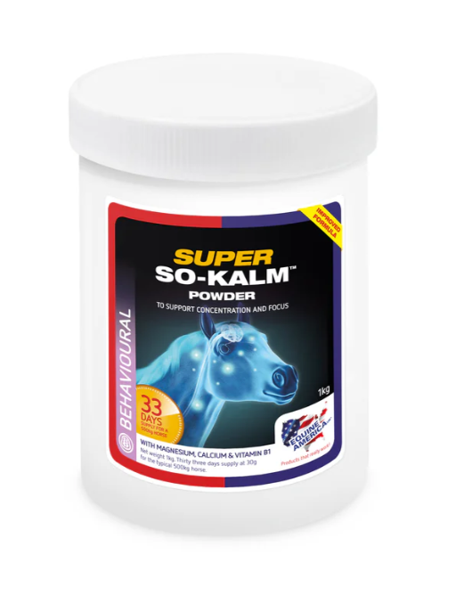 Super So Kalm poeder levert essentiële micronutriënten om een paard te helpen een kalme houding te behouden en zich op zijn werk te concentreren.