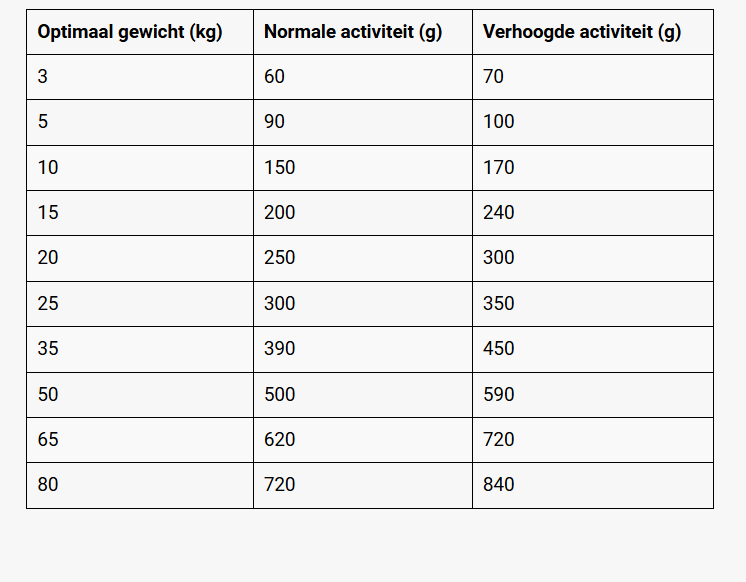 Als bijzonderheid, om de smaak te verbeteren, werd BELCANDO Adult Multi-Croc met een speciale saus uitgerust. Onder zorgvuldig roeren van 3 delen BELCANDO Adult Multi-Croc met 1 deel warm (40-50 °C) water vormt zich een bijzonder smakelijke saus over de brokjes. Dit is voor kieskeurige honden een bijzondere delicatesse. Maar ook bij droge voeding onderscheidt BELCANDO Adult Multi-Croc zich door de beste smaak. De gemiddelde waarden voor de hoeveelheid voer voor volwassen honden vindt u in de afgebeelde tabel. De juiste hoeveelheid voer kan het beste door een regelmatige gewichtscontrole van de hond berekend worden. Altijd vers drinkwater ter beschikking stellen.