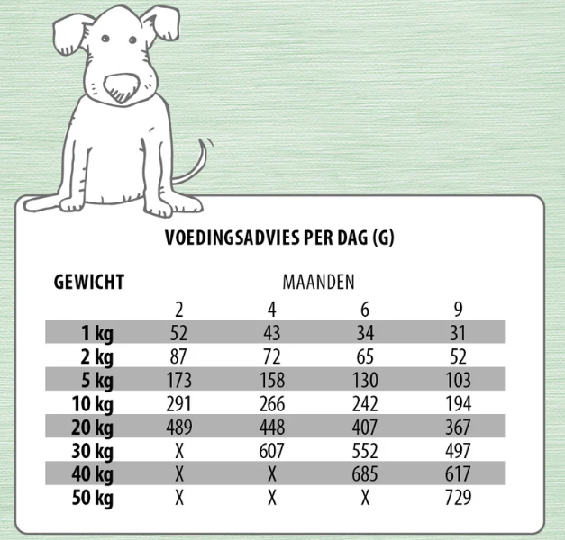 Een puppy heeft andere voedingsbehoeften dan een volwassen hond. Natural Large Puppy Kip van Jarco is een hoogwaardige natuurlijke en gezonde premium voeding, gemaakt zonder chemische antioxidanten, geur-, kleur- en smaakstoffen. Deze voeding heeft een speciaal samengesteld eiwit- en vetgehalte en de juiste mix van natuurlijke vitaminen en mineralen voor een gezonde groei en ontwikkeling van uw grote pup tot 9 maanden. Dat maakt deze voeding uitermate geschikt voor alle large rassen, met een volwassen gewicht van 26 – 45 kg.