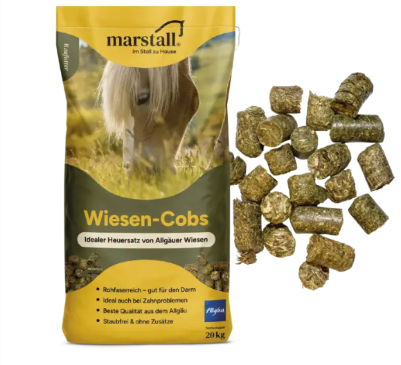 Marstall Wiesen-Cobs uit de Allgäu: met warme lucht gedroogde pellets van eerste snede gras (maaimoment in de bloei) van soortenrijke natuurweides uit de Beierse Allgäu. Bestaande uit meer dan 50 verschillende kruiden en grassen. In natuurlijke vorm, met ideale Ca:P verhouding, stofarm, rijk aan ruwe celstof, fructaanarm, zonder melasse, ideaal voor oudere en gevoelige paarden.