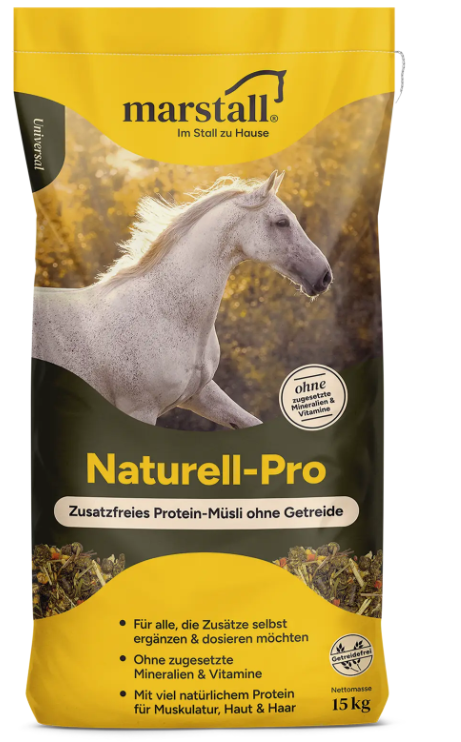 Marstall Naturell-Pro is het natuurlijke graanvrije eiwitsupplement voor spieronderhoud. De natuurlijke muesli bevat alleen inheemse voedingsstoffen en veel vezels die het kauwen bevorderen in de vorm van zacht timothee gras en Allgäu hooischijven.