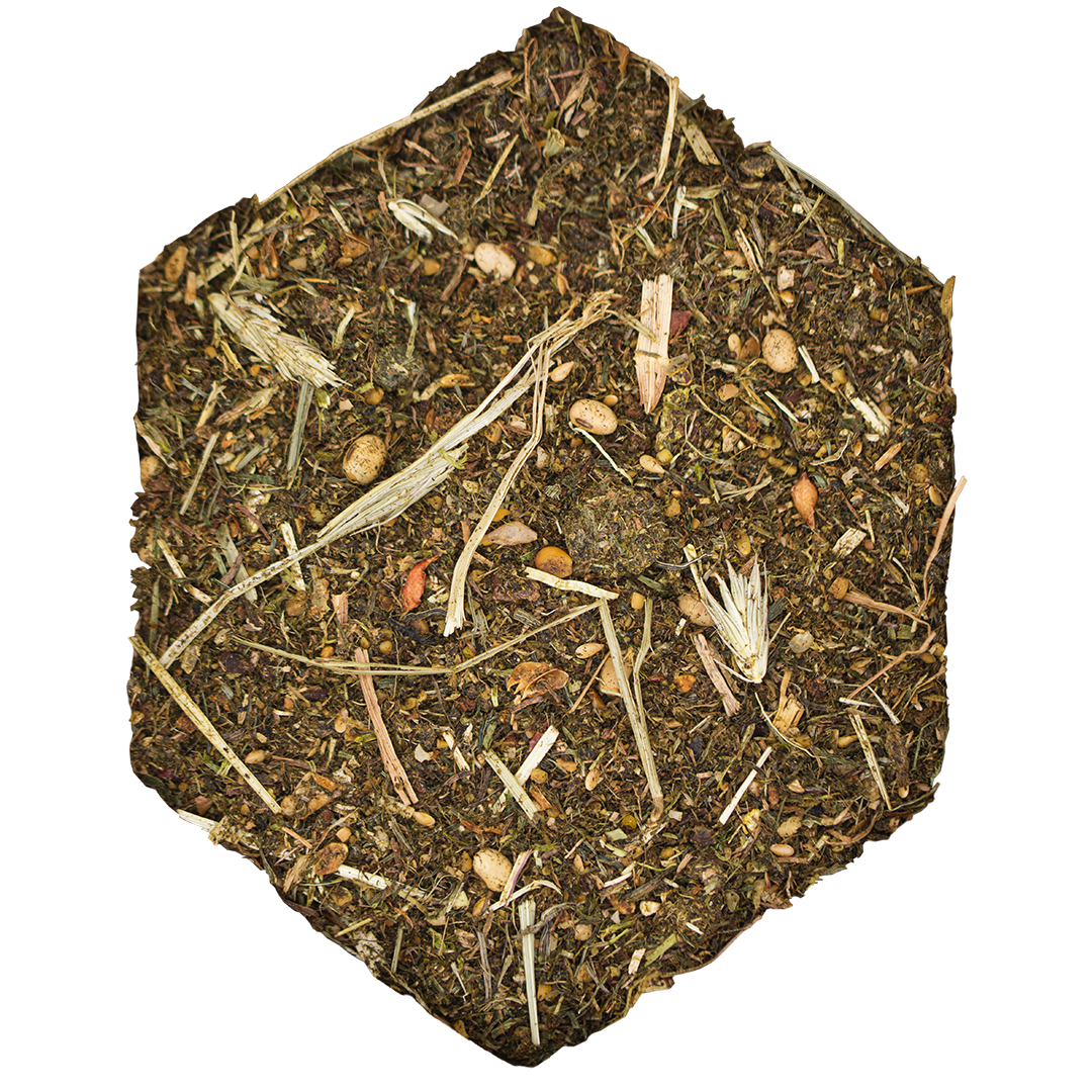 Gehakseld gras aan warme lucht gedroogd, sojavlokken hydrothermisch ontsloten*, fruitvezels (appel/druiven), maïskiemen, lijnzaad, lijnzaadolie, wortelen, erwtenvlokkenmeel.