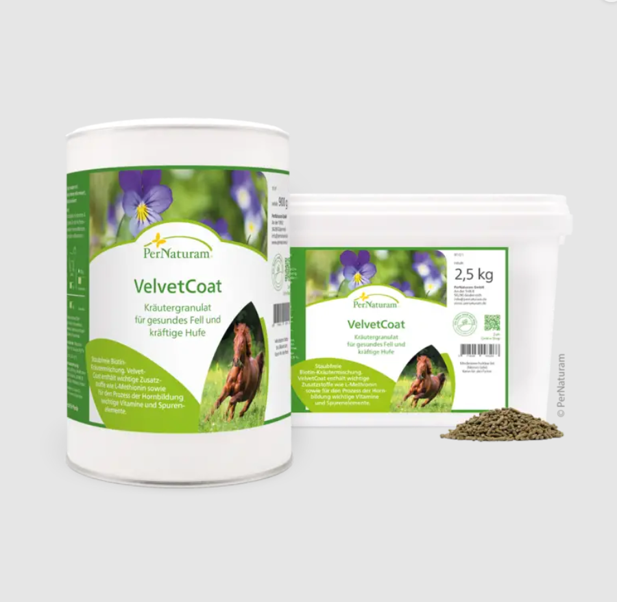 Gemicroniseerde kruiden en algen, die koud worden gegranuleerd, vormen de basis. De hoge beschikbaarheid van voedingsstoffen zorgt voor een ongewoon snel effect. VelvetCoat is het beste te combineren met fluweelolie.